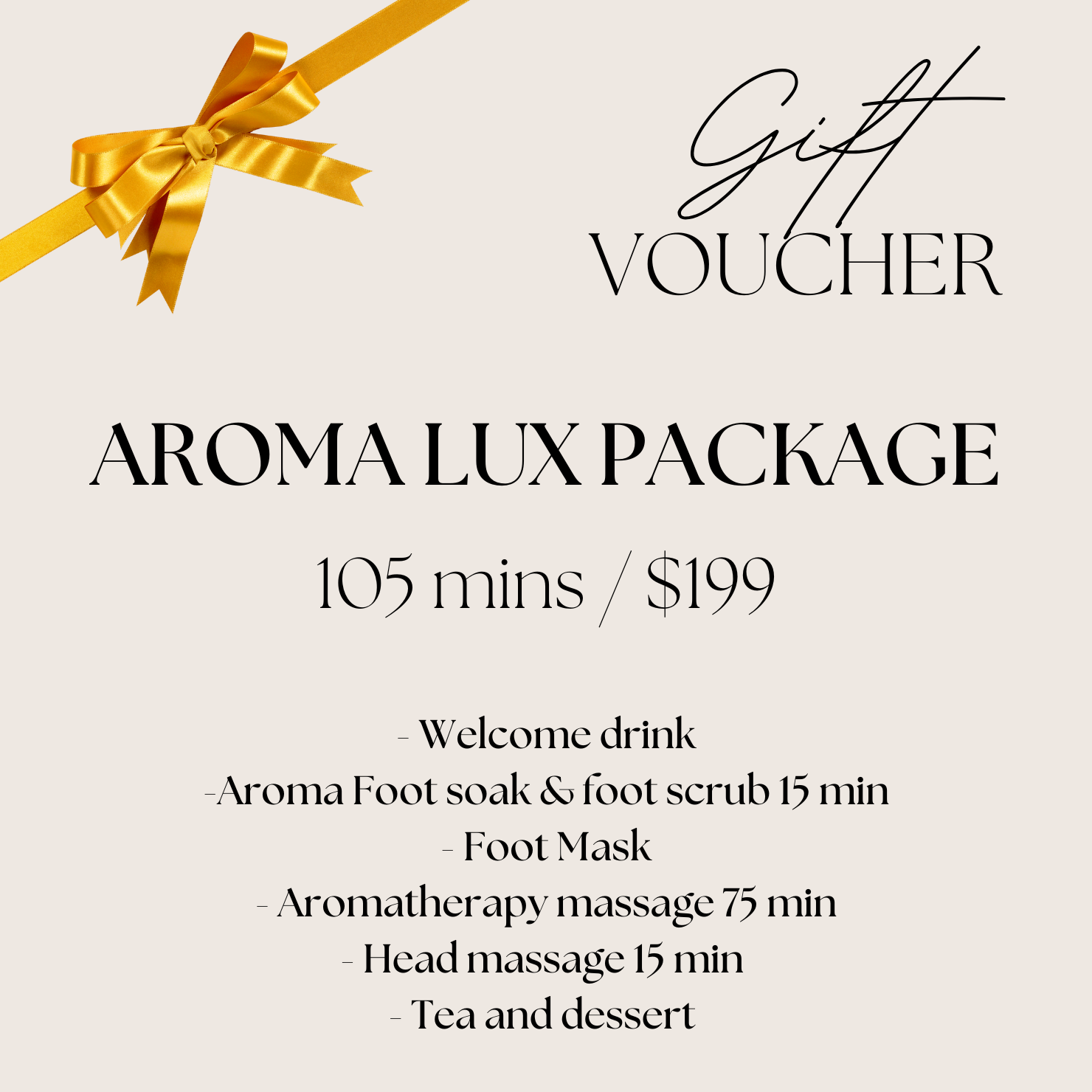 Immerse yourself in luxury with our Aroma Lux package, featuring a soothing aroma foot soak and scrub, a revitalizing foot mask, an indulgent aromatherapy massage, and a calming head massage